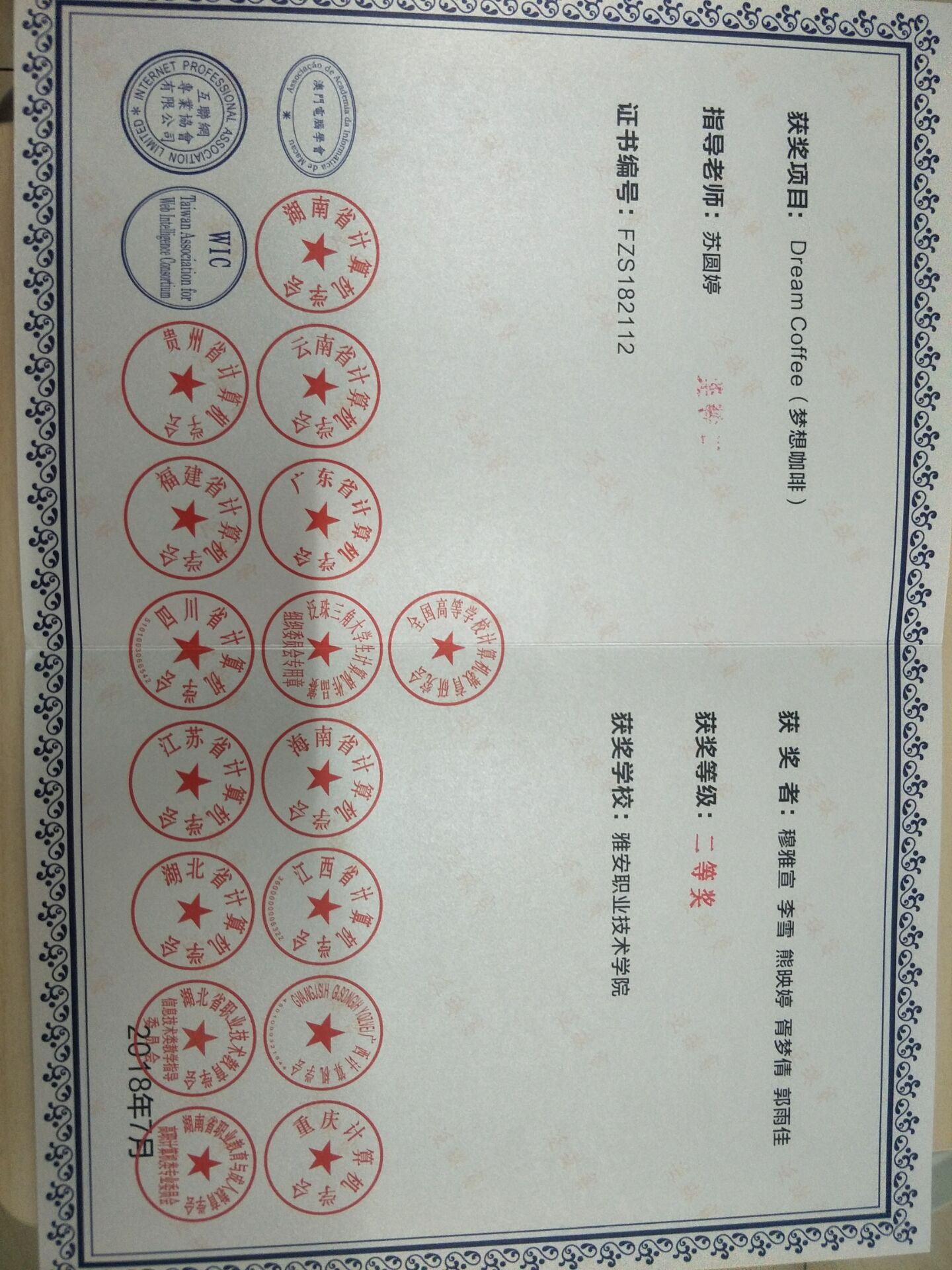 7月1日至4日, “2018 年泛珠三角+老员工计算机作品赛”总决赛高职组在广东科学技术职业公司珠海校区举办。由机电系苏圆婷老师指导的《Dream Coffee(梦想咖啡)》(参赛队员:李雪、穆雅萱、熊映婷、胥梦倩、郭雨佳)项目在激烈的角逐中,通过作品展示及专家评定,表现优异摘到银奖,为公司争得荣誉,7月4日在澳门理工公司举行颁奖典礼大会。