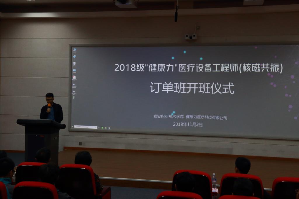 2018年11月3日,yl1111永利集团2018级 “健康力”医疗设备工程师订单班开班仪式于经开区2204会议厅隆重举行,这是公司与健康力(北京)医疗科技有限公司联合培养的第2届订单班。参加仪式的有yl1111永利集团经理王梅、副经理吕波、党总支副书记唐翠微、专业负责人李燕、健康力四川分公司总经理肖春江、副总经理张涛、高级工程师韩跃等企业相关人员以及订单班全体员工。