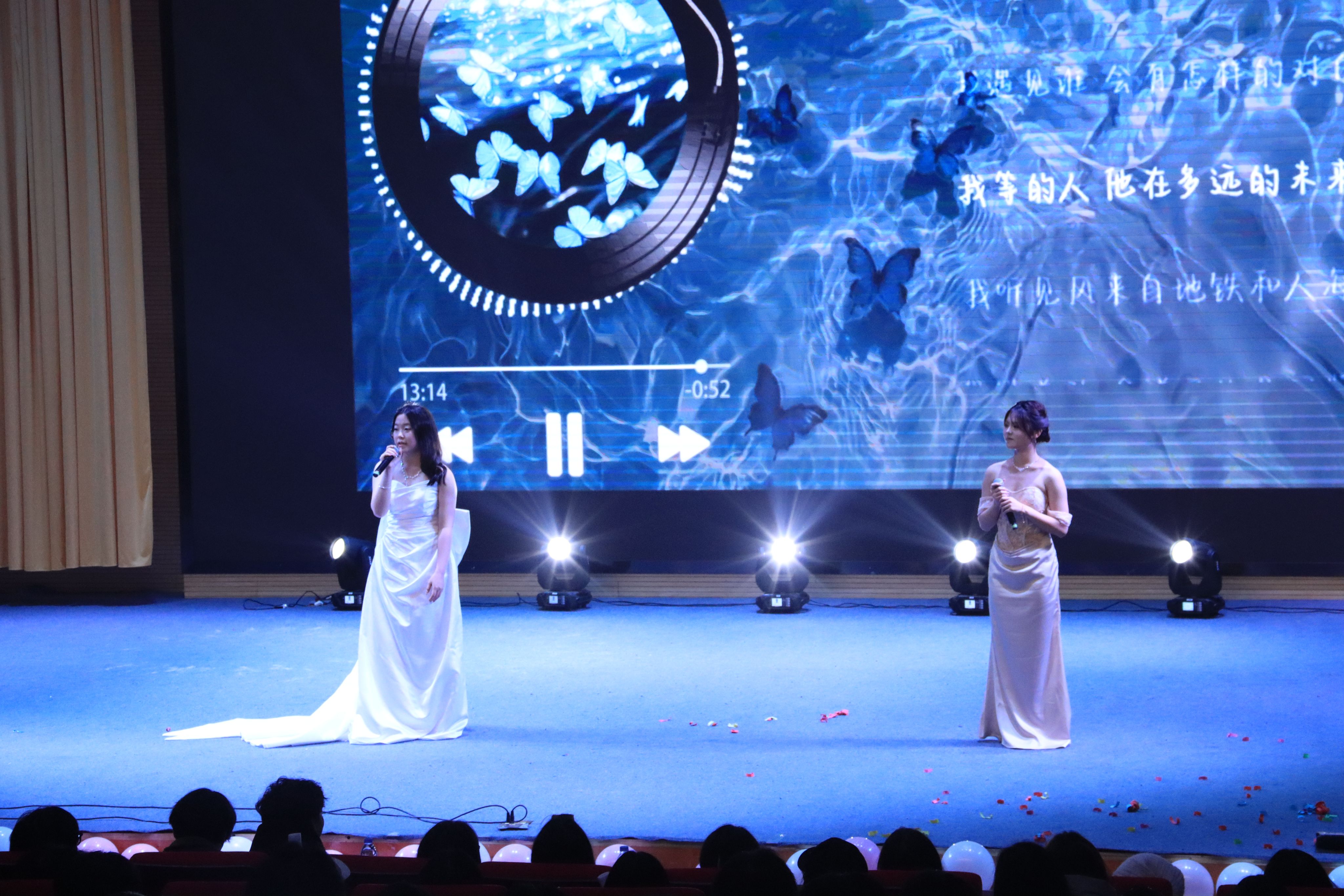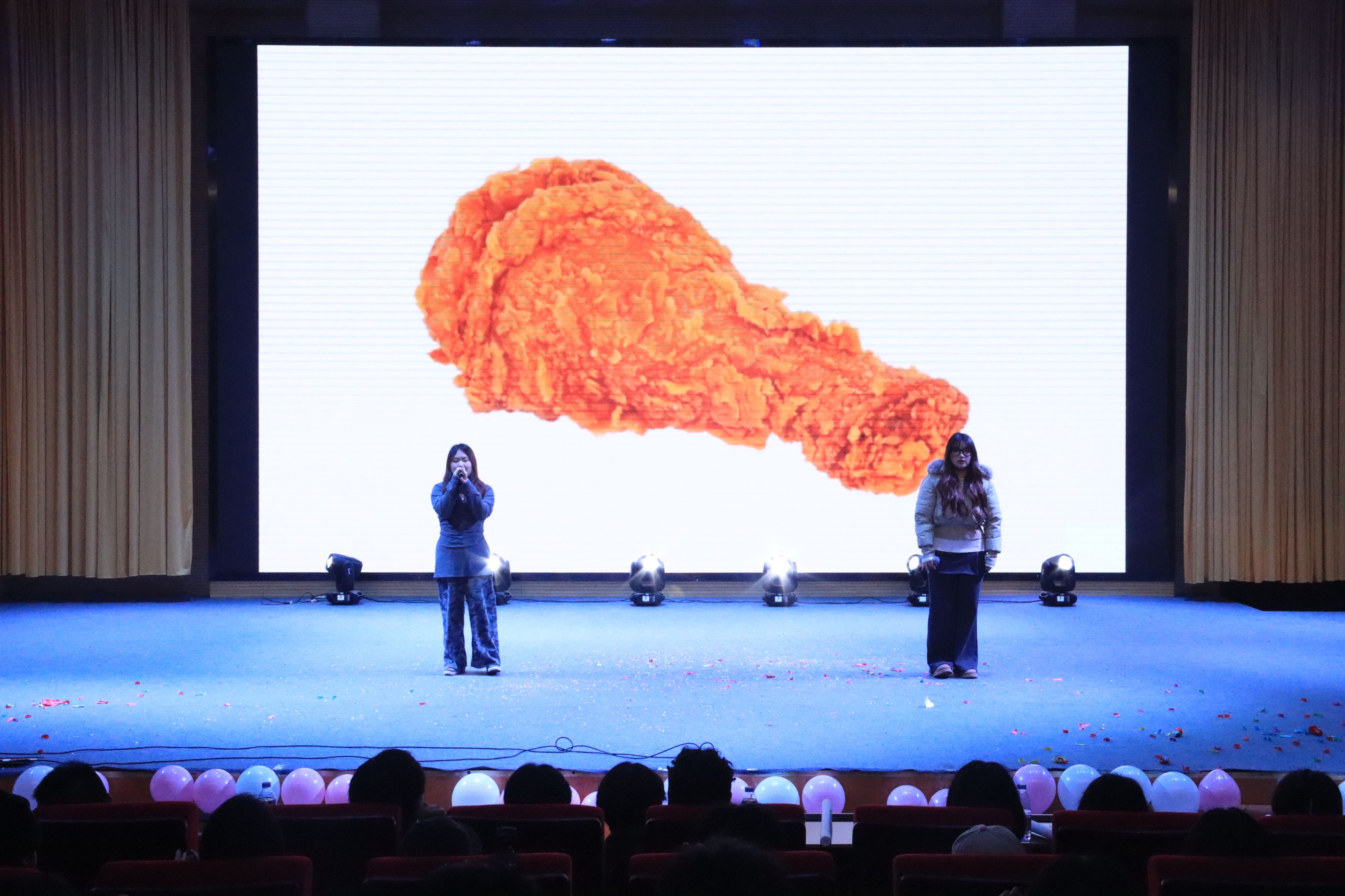晚会伊始,音乐协会雅青乐队以一曲《那个石家庄人》激情开唱,激昂的旋律瞬间点燃全场,观众随乐挥动荧光棒,现场化作合唱的海洋。整场晚会围绕“青春律动”“校园趣忆”“雅韵·文脉风采”“奔赴新程”四大篇章展开。序章“青春律动”中,《疆风汉影·贺岁华章》舞蹈串烧融合多元民族风情,歌曲《我们俩》《遇见》则以温暖嗓音传递青春絮语;篇章二“校园趣忆”里,灵动俏皮的舞蹈《借来的猫》与贴近生活的小品《就医》生动还原校园百态,引得掌声与笑声不断,随后的三轮抽奖环节更是惊喜连连,将气氛推向高潮。