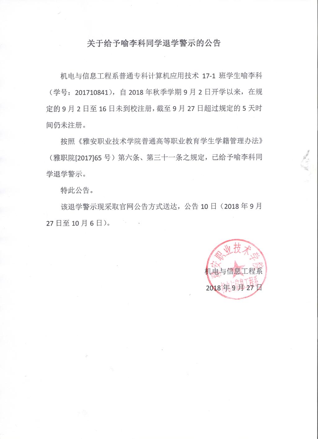 关于给予喻李科同学退学警示的公告