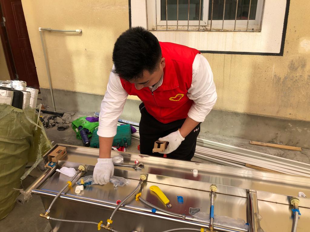 随后,以党员、电工技师王明伟率领驻村教师陈艾昕、闫国彬、村党员干部等快速组成了“1+N”志愿服务队,为高效优质完成任务,志愿服务队老师每天从早上7点工作到晚上8点,充分展现出党员教师吃苦耐劳、为群众排忧解难办实事的服务精神,圆满完成了4个热水淋浴系统的安装,以及浴室和食堂的水电改造升级,大大改善了祝桑乡小学师生的生活条件,受到老师们一致好评,小朋友们也开心的跳舞庆祝新浴室落成。